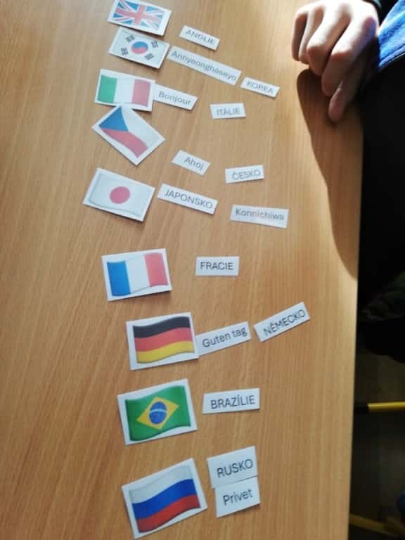 U starších dětí 2. a 4. oddělení bylo cílem děti naučit nové pozdravy z různých států, kde jsme poznávali i vlajky těchto zemí a přiřazovali k nim pozdrav. Chvíli jsme povídali o pozdravech. Po této činnosti jsme si i zasoutěžili. Naším úkolem bylo vyluštit osmisměrku. Ve dvojicích jsme potom tvořili vlajku a pozdrav vlastního „státu“. Když mají hotovo, každý se pochlubí a předvede, co dokázal včetně pozdravu. Na závěr jsme společně dali dohromady pozdravy, které se používají u nás a při jakých příležitostech.